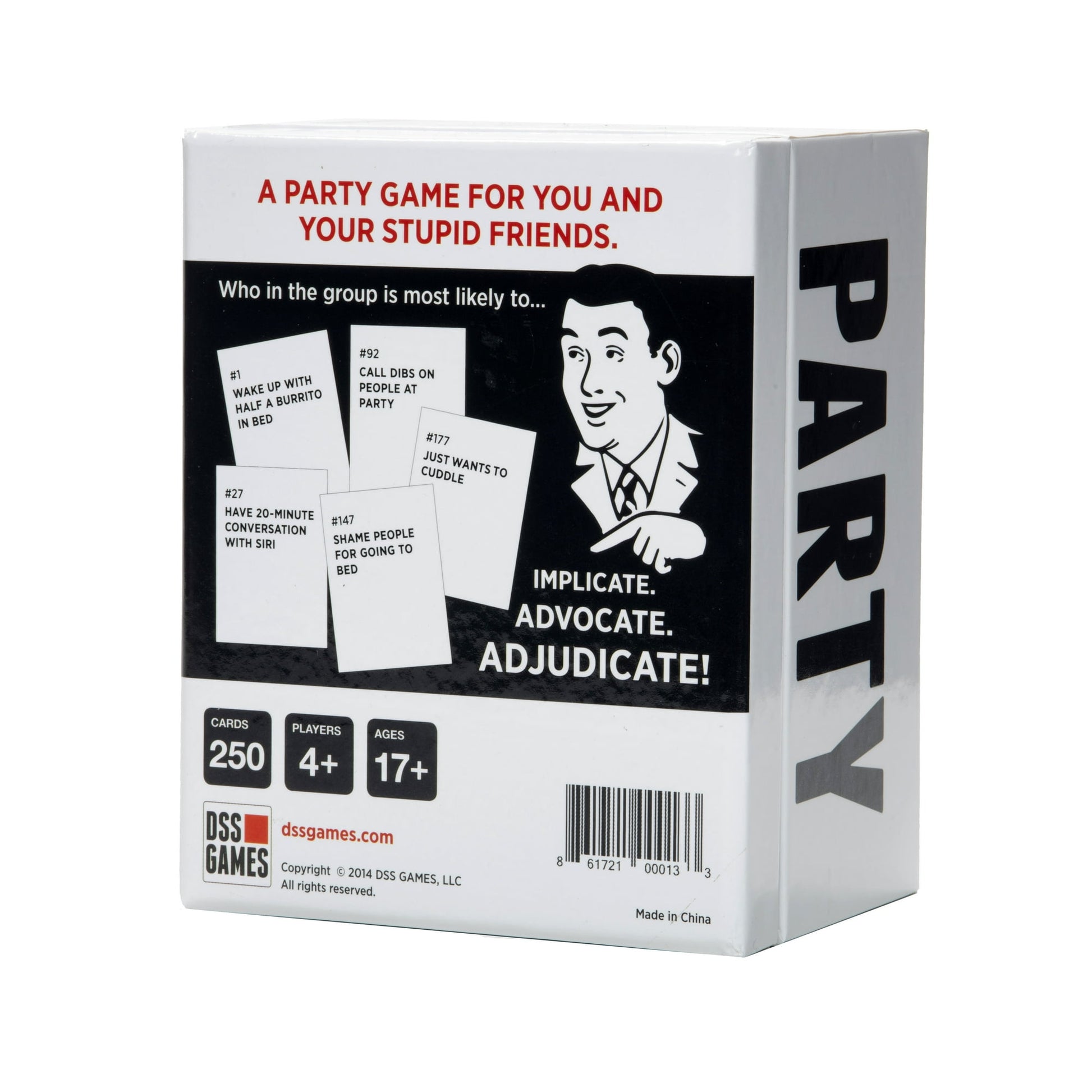Who's Most Likely To...is a party game for you and your stupid friends. Each round a card is drawn and the group decides who in the group would be most likely to: #92 Call Dibs On People At Parties, #119 Use Daddy's Credit Card and much more. First a player declares themselves the judge and reads a card aloud. Each person then says who in the group should be tagged with this card and why. Accusations can be based off of personality traits, past stories or really anything at all. As long as you can argue your point, it's fair game. The judge considers all accusations and makes the final ruling on who should be tagged with the card. This person keeps the card along with the shame. The judge rotates to the next person in the group. First person with seven cards loses. There are no winners in this game, only losers.